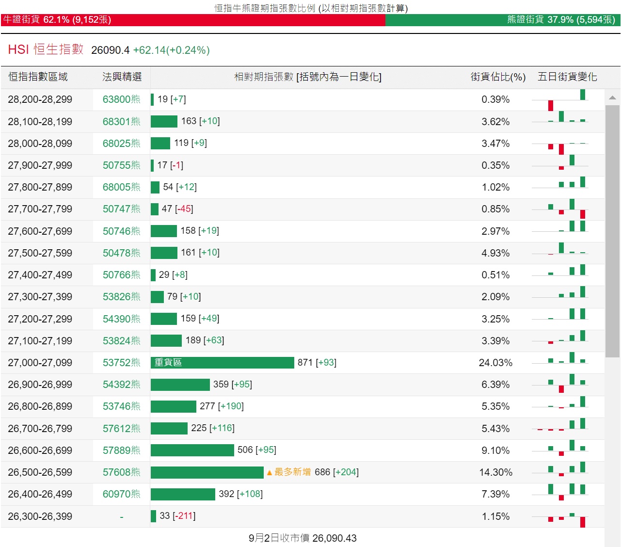 法兴恒指牛熊证街货分布图中的数据显示,熊证街货重货区在27,000-27,099区间,该区间最新熊证数量为871张,较上一交易日增加93张;最多新增在26,500-26,599区间,该区间最新熊证数量为686张,较上一个交易日增加204张。