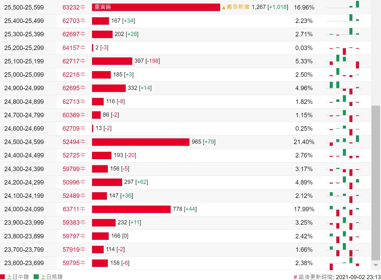 牛证街货重货区在25,500-25,599区间,该区间最新牛证数量为1267张,较上一交易日增加1018张;最多新增也在该区间。