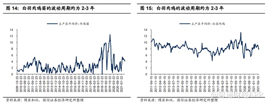 白羽肉鸡苗和白羽肉鸡的价格波动显示,目前我国白羽鸡行业已基本形成 2-3 年的波动周期,2019 年是白羽鸡价格高点,2020 年起由于产能持续处于高位,价格逐步下探。
