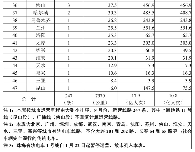8月份,新增佛山市南海有轨电车1号线1条运营线路、运营里程9.4公里。受疫情影响,8月份48个城市完成客运量环比下降3.8亿人次、下降18%,但同比去年8月增长0.5亿人次、增长3%。8月份,南京地铁S1、S7、S9号线因疫情防控需要先后停运,并于8月26日恢复正常运营;郑州地铁因“7·20”特大暴雨灾害导致全线网停运,目前尚未恢复。总体上,城市轨道交通在做好疫情防控的同时,基本满足社会公众正常出行需要。