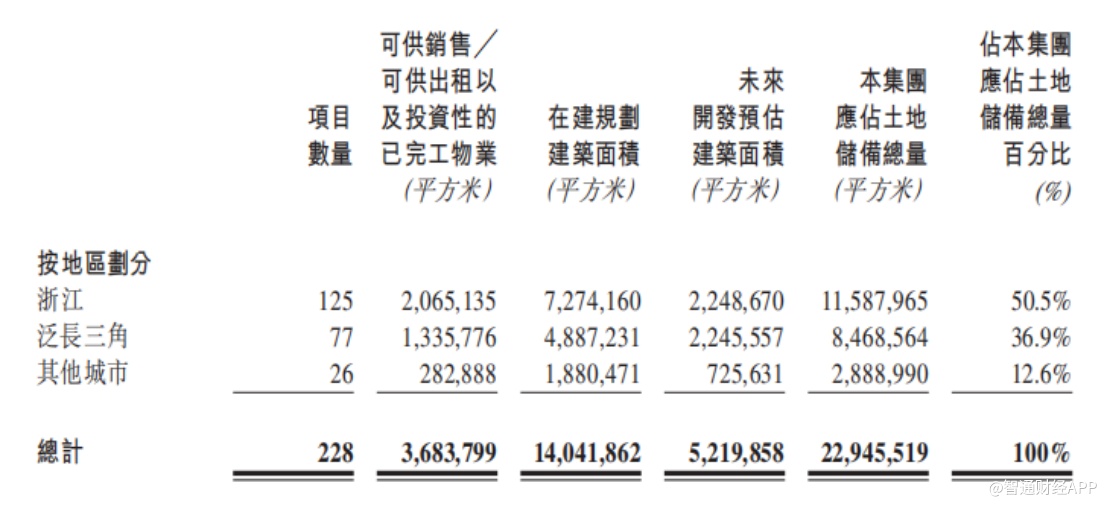 业绩公告显示,截至上半年末,祥生控股集团已在全国11个省份的47座城市共计拥有228个项目,集团应占土地储备总量达到2295万平方米。其中,浙江省、泛长三角及其他城市分别占比50.5%、36.9%和12.6%。