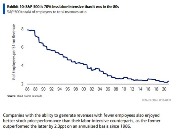 帮助企业免受工资上涨冲击的技术创新促使企业业务焦点从劳动力上转移,这进而提高了生产率,降低了工资波动对收入的影响。事实上,美国银行编制的数据显示,标普500指数的劳动密集程度较上世纪80年代下降了70%。35年前,大约8名员工才创造了100万美元的销售额;而现在,只需要两名员工。