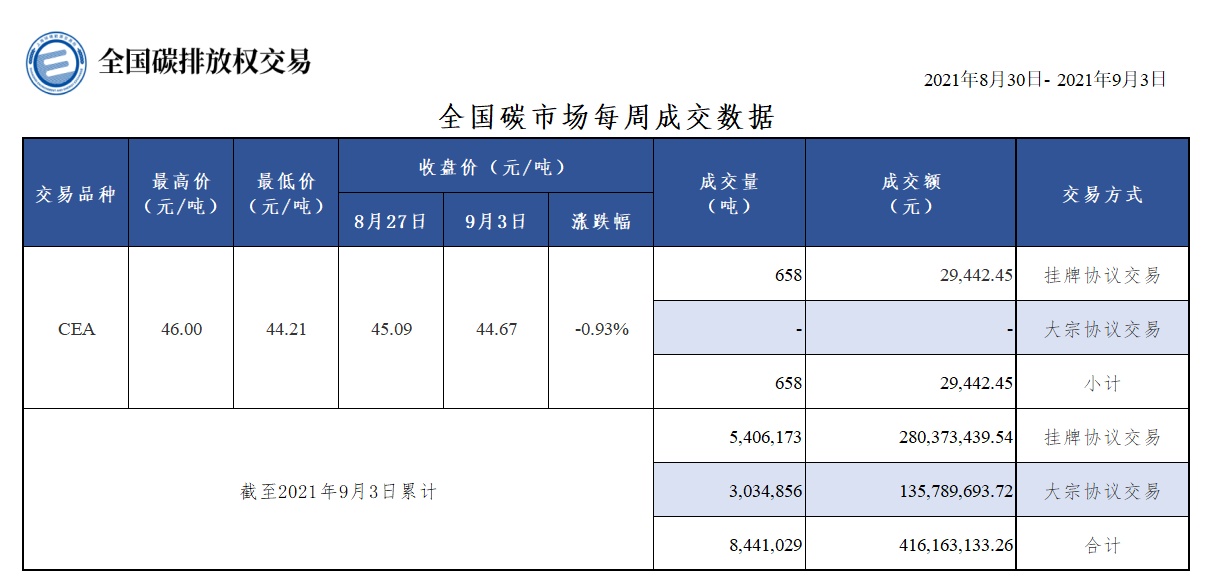智通财经APP获悉,9月3日,上海环境能源交易所股份有限公司披露,本周(8月30日至9月3日)全国碳市场碳排放配额(CEA)总成交量658吨,总成交额29,442.45元。挂牌协议周成交量658吨,周成交额29,442.45元,最高成交价46.00元/吨,最低成交价44.21元/吨,本周五收盘价为44.67元/吨,较上周五下跌0.93%。本周无大宗协议交易。