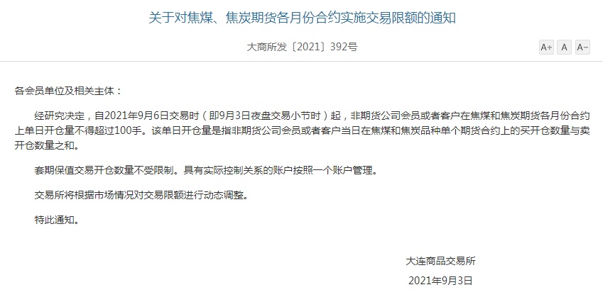 智通财经APP获悉,9月3日,大连商品交易所发布《关于对焦煤、焦炭期货各月份合约实施交易限额的通知》,决定自2021年9月6日交易时(即9月3日夜盘交易小节时)起,非期货公司会员或者客户在焦煤和焦炭期货各月份合约上单日开仓量不得超过100手。该单日开仓量是指非期货公司会员或者客户当日在焦煤和焦炭品种单个期货合约上的买开仓数量与卖开仓数量之和。套期保值交易开仓数量不受限制。具有实际控制关系的账户按照一个账户管理。