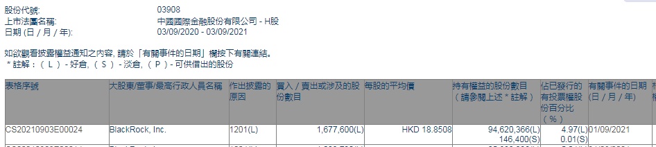智通财经APP获悉,香港联交所最新资料显示,9月1日,贝莱德减持中金公司(03908)167.76万股,每股作价18.8508港元,总金额约为3162.41万港元。减持后最新持股数目约为9462.04万股,最新持股比例为4.97%。