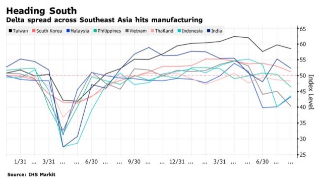 Henry表示:“在美国和欧洲国家,疫苗接种率普遍较高,而且经济重启仍在继续,经济增长更具弹性。但这些经济体可能会受到其他地区delta变种造成生产中断的影响,例如马来西亚的工厂关闭。”