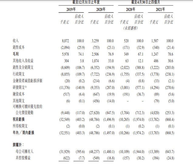 于2019年、2020年以及截至2021年4月30日止四个月,堃博医疗控股有限公司收入分别为约807.2万、325.9万及158.7万美元。