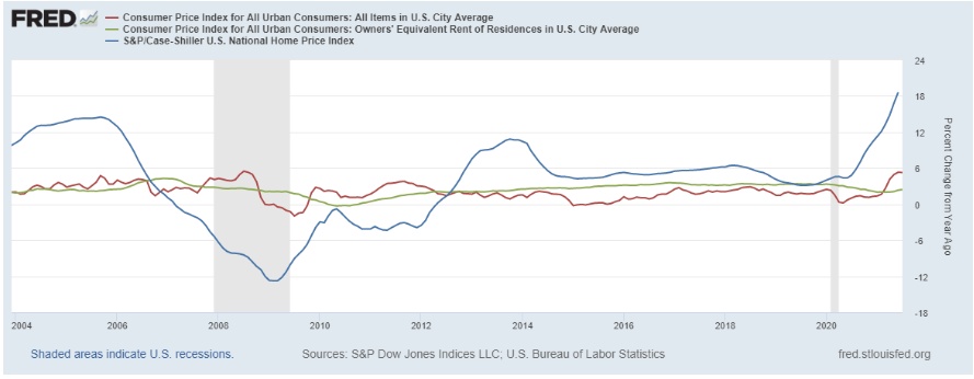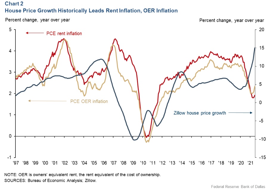 达拉斯联储指出,房屋价格上涨仅领先租金和业主等价租金通胀不到两年时间。这意味着租金将迎头赶上,尤其是在标普/Case-Shiller房价指数6月份同比飙升18.6%的情况下,该数据创下历史新高,相比之下,去年同期仅为4.4%。