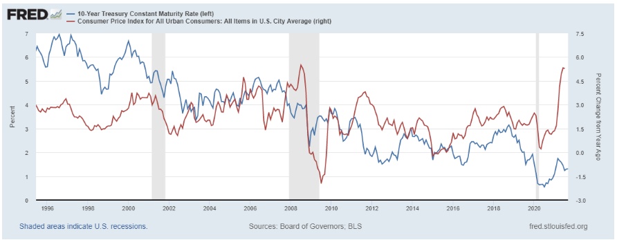 如果美联储实现最大就业和控制通胀的双重使命继续得到改善,那么目前处于历史水平的10年期美国国债收益率与消费者价格增长水平之间的差距(自2008年7月CPI增长峰值以来从未出现过)可能意味着国债收益率的上升幅度大于CPI的下降幅度,这意味着美联储将加快缩减资产购买规模的步伐。克里夫兰联储主席Loretta Mester等部分美联储成员最近表示,预计美联储将在今年某个时候开始缩减购债规模。