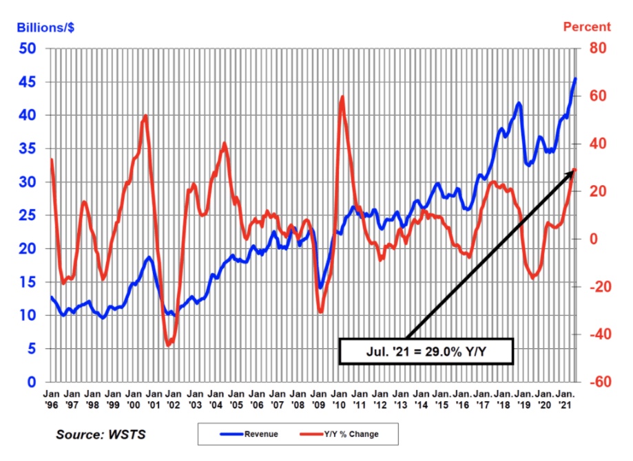 智通财经APP获悉,根据美国半导体行业协会(SIA)公布的最新数据,7月份全球半导体销售额同比增长29%,达到454亿美元,较上月环比增长2.1%。