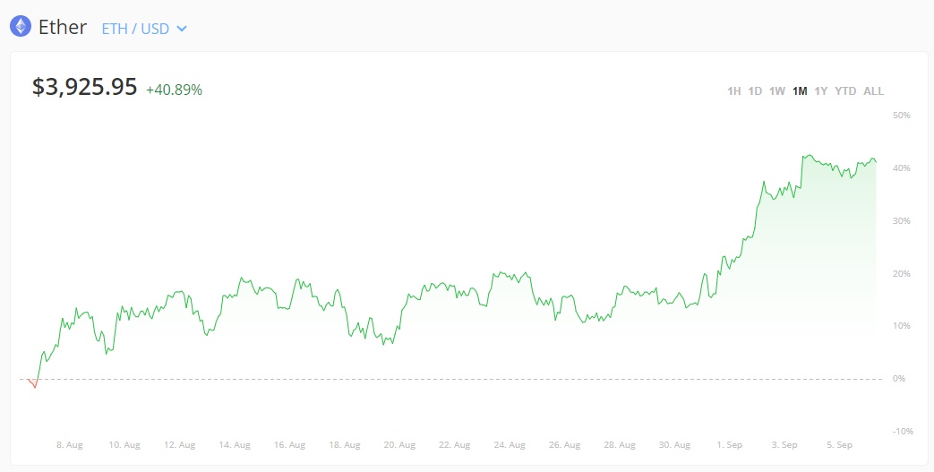 随着大部分去中心化金融交易和非同质化代币(NFT)交易发生在以太坊区块链上,在过去一个月,市值第二大加密货币以太坊从2700美元上升至3900美元,涨幅较比特币高出了17%,截至发稿,以太坊报3925.95美元/枚。