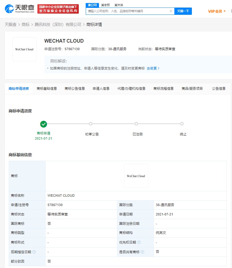 CLOUD商标,国际分类涉及网站服务、通讯服务、广告销售等,目前商标状态为等待实质审查。