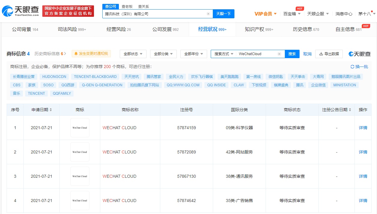 智通财经APP获悉,天眼查App显示,近日,腾讯科技(深圳)有限公司申请注册WECHAT
