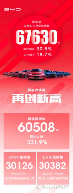 官方数据显示,比亚迪乘用车8月全系销售67630辆,同比增长90.5%,环比增长18.7%;其中新能源乘用车销售60508 辆,同比增长331.9%。比亚迪的销量连续四个月大幅增长,不断刷新着自己的月销纪录,这不仅表明了比亚迪战略布局的正确性,也充分显示出市场对比亚迪的肯定。