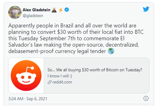 推特和Reddit等平台上的用户正在讨论9月7日集体购买价值30美元比特币的计划,以纪念萨尔瓦多的比特币法正式生效。这种潜在的协同性价格抬升手段与之前针对游戏驿站(GME.US)等Meme股的线上大型活动非常相似。