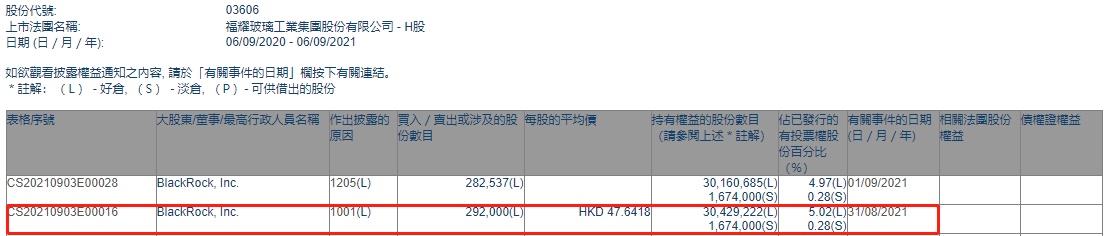 智通财经APP获悉,香港联交所最新资料显示,8月31日,BlackRock, Inc.增持福耀玻璃(03606)29.2万股,每股作价47.6418港元,总金额约为1391.14万港元。增持后最新持股数目约为3042.92万股,最新持股比例为5.02%。