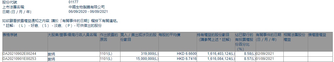 智通财经APP获悉,香港联交所最新资料显示,9月01-02日,执行董事谢炳分别增持中国生物制药(01177)1500万股、31.9万股,每股作价分别为6.7416港元、6.6600港元,总金额约为1.03亿港元。增持后最新持股数目约为16.16亿股,最新持股比例为8.58%。