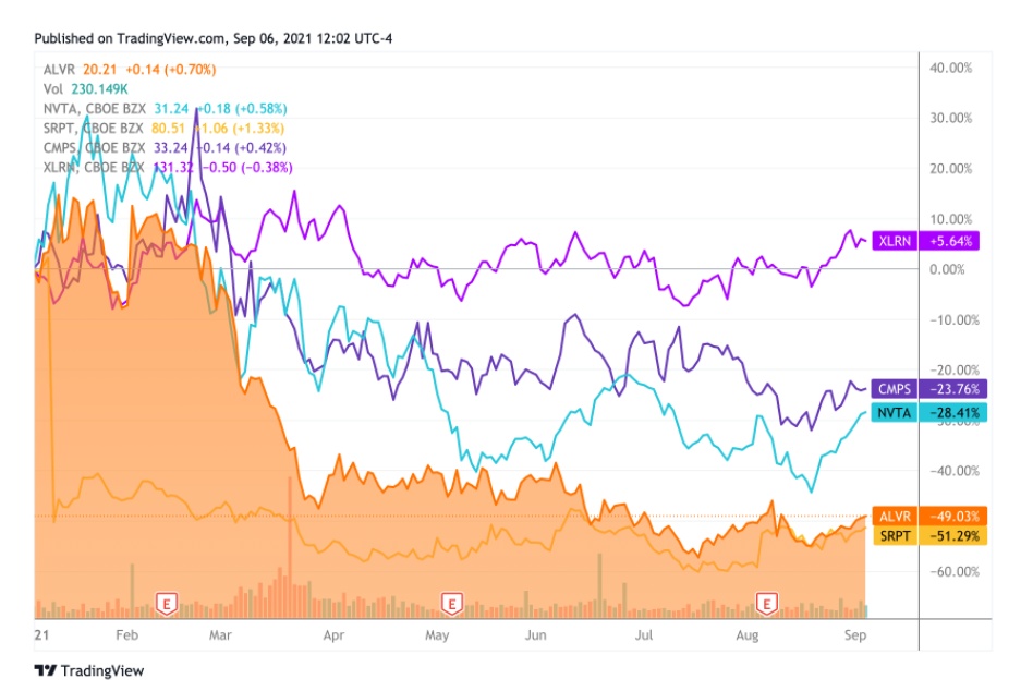 Pharma(XLRN.US)、Invitae(NVTA.US)、Sarepta Therapeutics(SRPT.US)、Compass