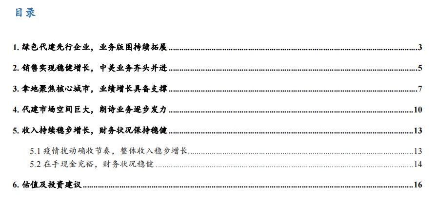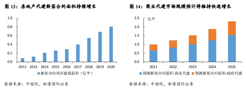 根据中指研究院报告,中国房地产代建潜在市场预期将继续由2020年的约6.84亿平方米增长至2025年的约9.11亿平方米。在2020年,中国商业代建市场规模为3.50亿平方米,其中2.66亿平方米为住宅物业,预期该市场规模于2025年会增长至6.18亿平方米,其中4.87亿平方米为住宅物业。根据中指院测算,预计截至2025年,新签代建合约建筑面积将达2.32亿平方米,其中约66.0%将由房地产商业代建所贡献。公司早在2014年即开始实施“资产轻型化”战略,绿色代建业务起步较早,目前已成为国内领先的代建管理服务商之一,自然能够获得代建市场发展的先机。
