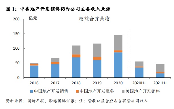 因公司轻资产的业务特点,权益合并收入是分析公司营收的较合适指标。2020年,公司权益合并营收总额为145.4亿元,其中中国地产开发销售、中国地产开发服务和美国地产开发销售收入占比分别为59.5%、4.7%和35.8%。2021年上半年公司权益合并收入由55.0亿元降至46.4亿元,主要系上半年中国地产结转收入下降影响;代建收入占中国地产业务收入(表内)的比重则由去年同期的29%提升至当期的46%。