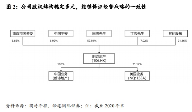 截至2020年末,公司主席田明先生合计持有朗诗地产约57.94%股份,丁宏先生持有公司约7.02%股份,中国平安及南京国资分别持有公司约6.92%和6.66%的股份,其他股东则持有约21.46%的股份。整体而言,公司目前股权结构较为稳定多元,治理结构较为合理,能够保持战略与经营上的一致性和连贯性。