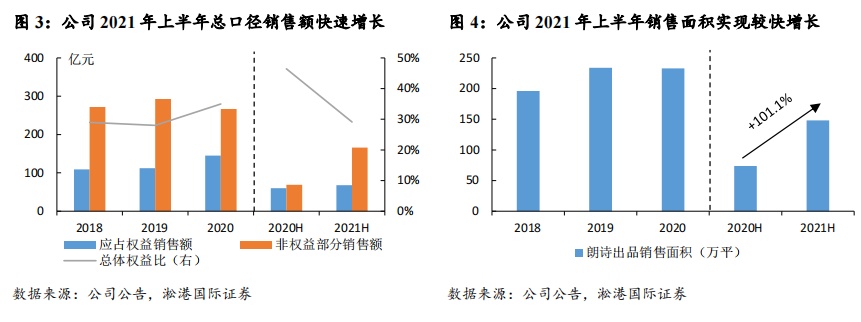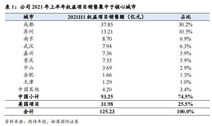 公司多年来坚持深耕国内三大都市圈及美国主要城市。2021年上半年,公司权益项目销售额中成都、苏州、南京、武汉、嘉兴和重庆占比分别为30.2%、10.5%、6.9%、6.3%、5.9%和5.9%,其他城市也均为重点一二线及都市圈城市。美国业务方面,公司坚持本土化运营策略,2020年朗诗美国地产销售额达人民币69.1亿元,同比增长约73%。延续此前良好销售势头,2021年上半年朗诗出品实现全口径销售额约234.0亿元,同比增长约81.6%;签约建面约148.0万平,同比增长约101.1%。
