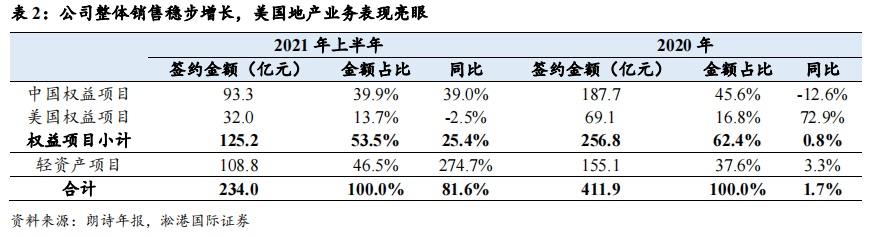 公司2015年起实施资产轻型化的战略,近年来在国内获取了大量代建管理项目,新增权益项目多为投资参股项目,部分较优质项目为公司附属公司开发,整体运营模式持续向轻资产转型。美国业务方面,公司目前旗下项目绝大多数为全资项目,目前已在全美房地产建筑商中位列前50。2020年,公司美国地产项目销售签约额达人民币69.1亿元,同比增长约73%。截至2021年上半年末,美国业务的资产配置约占公司的33%。