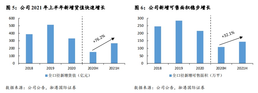 2021年上半年,公司总口径新增货值267.3亿元,同比增长76.2%,平均权益比约52%;中国新增货值约59%位于长三角,7%位于大湾区,中西部和环渤海占比分别为16%和18%。截至2021年上半年末,公司中国总口径可售货值达809亿元,一线、新一线及二线占比分别为3%、57%和12%(城市能级划分根据第一财经新一线城市分类);美国业务货值达187亿元,加州、亚利桑那州、纽约大都会区和德州及佛州占比分别为50%、36%、9%和5%。总体而言,公司重点布局城市基本面强劲,能够有效支撑公司今后的业绩增长。