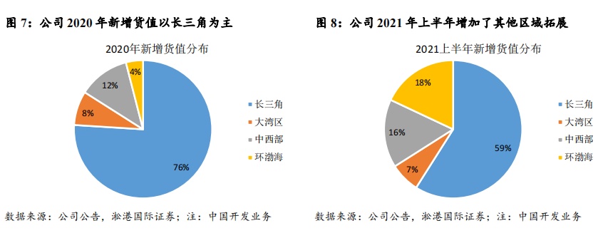 2020年,公司继续通过多元渠道获取土地储备,全年在中国新增储备项目20个,其中长三角及大湾区合计储备项目货值达约85%;美国新增储备项目15个,位于加州及亚利桑那州;新增货值平均权益比约24%。从区域布局看,公司2020年中国新增土储货值约76%位于长三角,8%位于大湾区,中西部和环渤海占比分别为12%和4%。2021年上半年,公司总口径新增货值267.3亿元,同比增长76.2%,平均权益比约52%。公司2021年上半年中国新增货值约59%位于长三角,7%位于大湾区,中西部和环渤海占比分别为16%和18%。整体看,公司拿地节奏保持了一贯的稳健态势,能够有效支撑公司未来的持续发展。