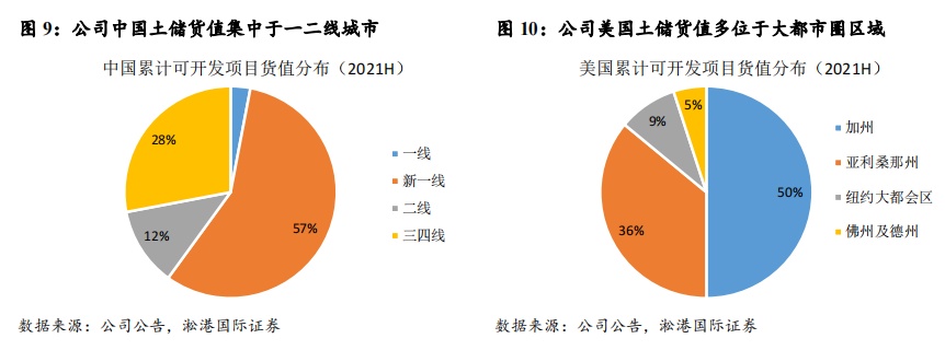 截至2021年上半年末,公司总可售货值约996亿元(权益比约29.5%),2020年末为1043亿元(权益比约20.3%);可售面积499万平,2020年末为529万平。其中,公司中国货值达809亿元,一线、新一线及二线占比分别为3%、57%和12%(城市能级划分根据第一财经新一线城市分类);美国业务货值达187亿元,加州、亚利桑那州、纽约大都会区和德州及佛州占比分别为50%、36%、9%和5%。不论中国地产业务还是美国地产业务,公司均坚持了围绕核心城市进行布局。总体而言,公司重点布局城市基本面强劲,能够有效支撑公司今后的业绩增长。