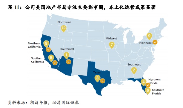 自2013年进入美国房地产市场以来,朗诗坚持本土化运营和优选区域布局,通过持续深耕现有运营区域提升市场份额,沿微笑曲线布局主流都市圈城市。公司美国业务员工及客户绝大多数为美国本土居民,本土化运营效果良好。除内生增长外,公司亦积极通过并购扩张规模。2021年4月,公司宣布拟以5460万美元收购Vintage Estate Homes,借此首次进入佛罗里达州及得克萨斯州,美国业务布局进一步完善。截至2021年上半年末,公司美国业务的资产配置约占公司整体的约33%。随着美国本土化运营的持续推进,公司未来发展也将得到更多支撑。