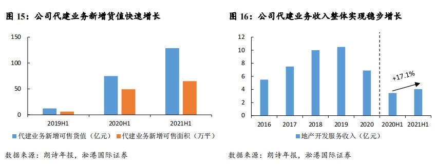 朗诗集团创立于2001年,是一家具有绿色环保、纵向一体化专业能力的国际性开发服务商。朗诗自2004年开始实施聚焦绿色科技差异化发展战略,目前主营业务为地产开发销售及开发服务(代建轻资产),业务版图也从中国地产成功拓展至了美国地产。2021年1月,公司美国地产业务于纳斯达克上市,成为在美上市的第18家建商。近年来,随着“资产轻型化”战略全面实施,公司代建管理业务快速发展,2021年上半年实现代建服务收入约4.05亿元,同比增长17.1%;新增可售货值及新增可售面积分别从2019年上半年约12.3亿元及6.2万平,快速增长到今年上半年约128.6亿元及64.9万平,三年复合增长率均超过220%。