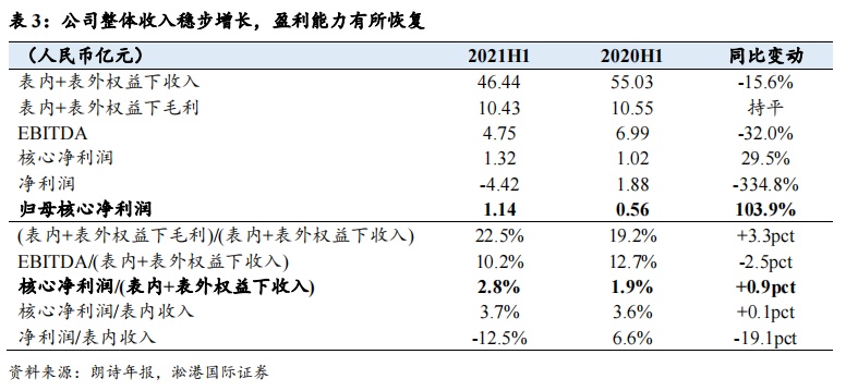 2021年上半年,公司表内收入由28.5亿元同比增长24%至35.4亿元;权益合并收入由2020年上半年的55.0亿元降至当期的46.4亿元,主要系今年上半年结算结构变化,中国开发销售业务确收减少所致。毛利率方面,公司2021年上半年(表内+表外权益下毛利)/(表内+表外权益下收入)为22.5%,较2020年上半年同比提升3.3个百分点,主要系美国地产业务综合毛利率同比提升了11.4个百分点。利润方面,公司2021年上半年实现归母核心净利润1.14亿元,同比大增103.9%。