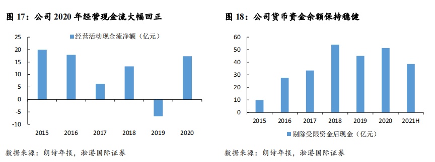 截至2021年上半年末,朗诗应占权益下的已售未入账物业面积为128.6万平(2020年上半年末:106.9万平),对应金额约为人民币202.6亿元(2020年上半年末:约人民币162.7亿元)。公司2020年并表销售收入89.9亿,表外应占合联营公司权益销售收入55.5亿,预收款对营收覆盖较为充足,未来业绩结转具备一定的确定性。另外,公司截至2021年上半年末拥有独立第三方委托开发管理项目50个,可售面积278万平,预计可售货值约人民币595亿元,也能一定程度上支撑公司代建业务的业绩。