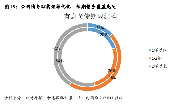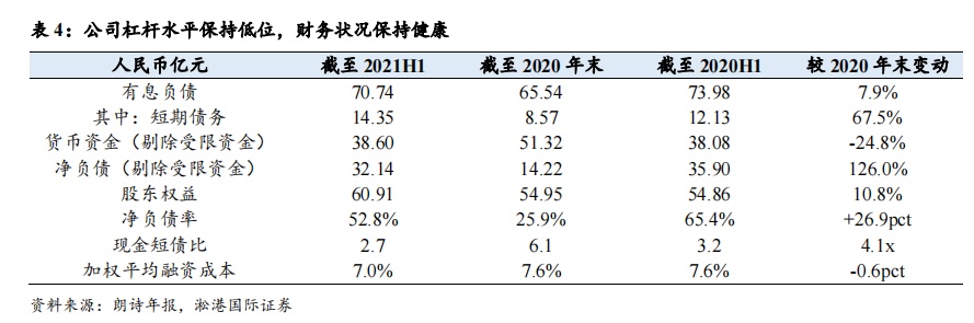 截至2021年上半年末,公司净负债率约为52.8%,2020年末及2020年同期分别为25.9%和65.4%,继续保持在业内较低水平;现金短债比约为2.7倍,2020年末及2020年同期分别为6.1倍和3.2倍,在手现金对短期债务覆盖充足。债务结构方面,截至2021年6月末公司1年内到期短期借款占比为20%,2020年末约为13%;期限2年以上借款比例则由2020年末的41%提升至2021年6月末的54%,债务结构继续优化。融资成本方面,公司2021年上半年加权平均融资成本约为7.0%,较2020年下降了0.6个百分点,融资成本管控得当。