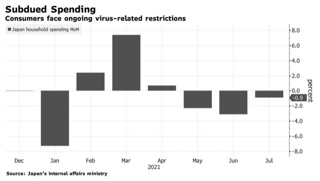 7月份家庭支出的下降表明,随着政府继续呼吁餐馆和酒吧提前关门,呼吁人们保持谨慎,高度传染性的delta变种的传播正在对消费者产生寒蝉效应。上个季度,消费者无视疫情警告,帮助日本避免了经济衰退,但疫情也进一步扩散。