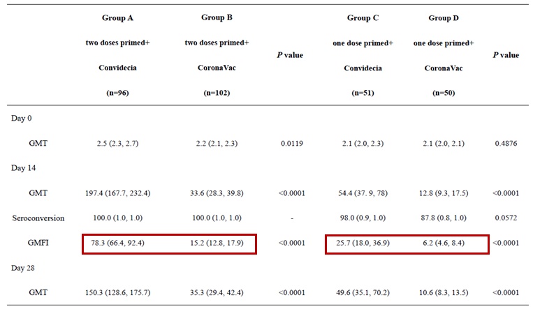 研究人员给志愿者接种两针灭活疫苗后,再接种一针腺病毒载体新冠疫苗作为加强,14天后中和抗体GMTs为197.4 (167.7, 232.4),抗体水平升高约78倍;若第三针用灭活疫苗进行加强,抗体水平为33.6 (28.3, 39.8),升高约15.2倍。该数据表明,序贯加强后产生的中和抗体增长水平显著优于同源加强的效果。