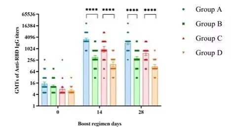 不同接种程序下RBD-特异性ELISA抗体反应对比