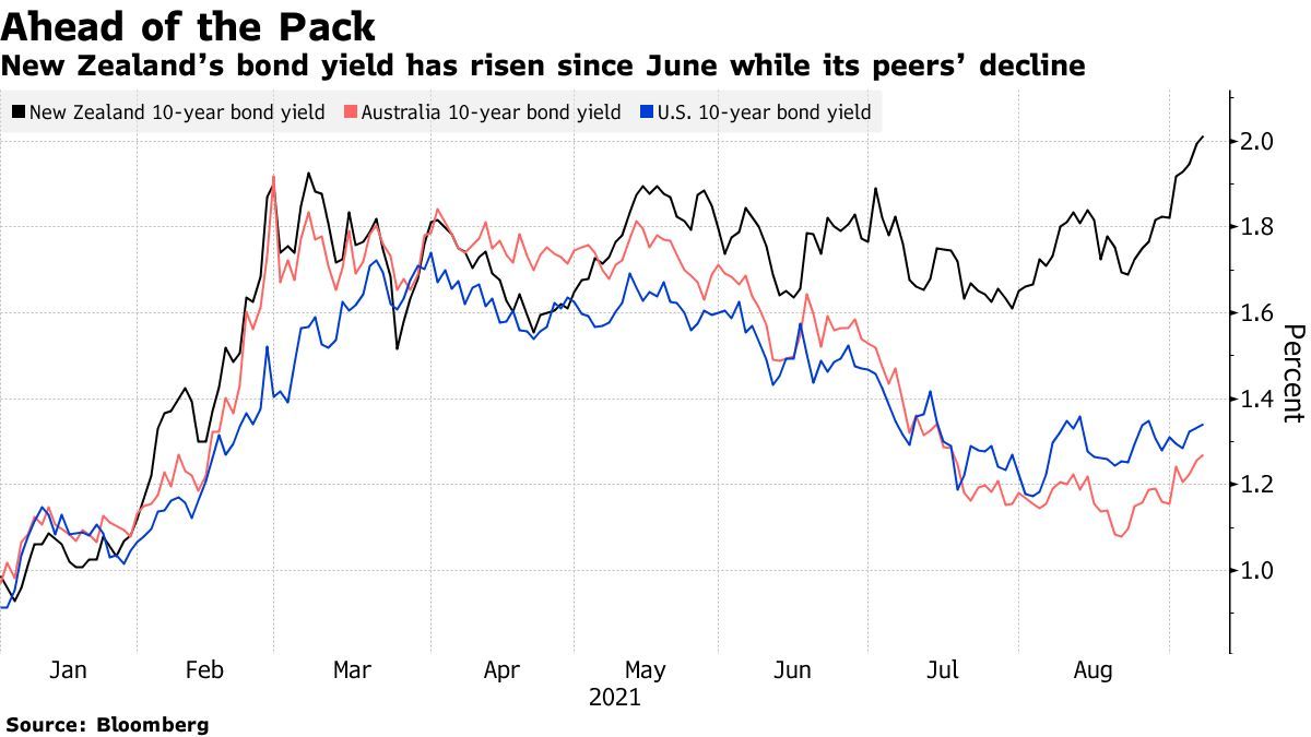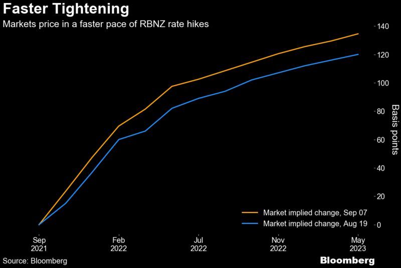 新西兰联储(Reserve Bank of New Zealand)在逐步退出经济刺激措施方面走在了大多数发达经济体的前列。该国在7月份结束了债券购买计划,市场预期新西兰联储可能在明年年底前将利率上调逾100个基点。