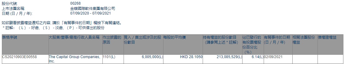 智通财经APP获悉,香港联交所最新资料显示,9月2日,The Capital Group Companies, Inc.增持金蝶国际(00268)600.5万股,每股作价28.1050港元,总金额约为1.69亿港元。增持后最新持股数目约为2.13亿股,最新持股比例为6.14%。