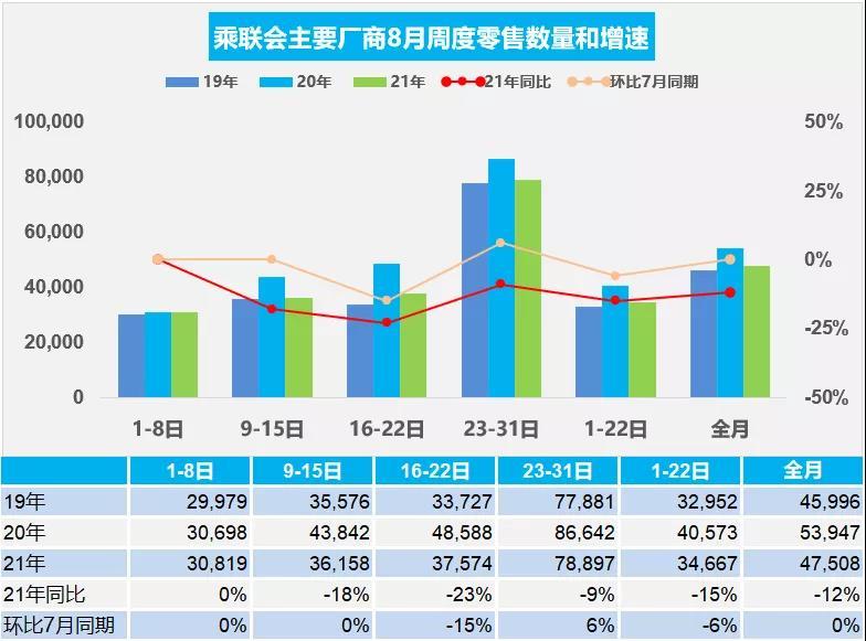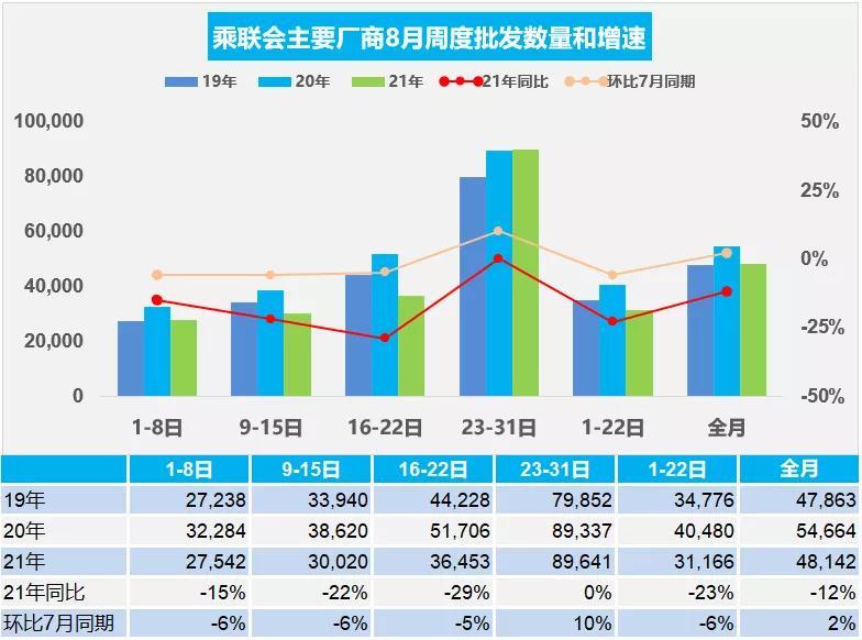 乘联会发布的批发数据显示,8月第一周日均批发2.8万辆,同比下降15%,走势相对放缓。本周相对于7月第一周的销量下降6%;8月第二周日均批发3.0万辆,同比下降22%,走势相对偏低。本周相对于7月第二周的销量下降6%;8月第三周日均批发3.6万辆,同比下降29%,走势相对偏低。本周相对于7月第三周的销量下降5%。8月第四周是月末,目前初步统计日均批发9.0万辆,相比2020年8月同期基本持平,部分非合资厂商走势较强。本周相对于7月第四周的销量增长10%。