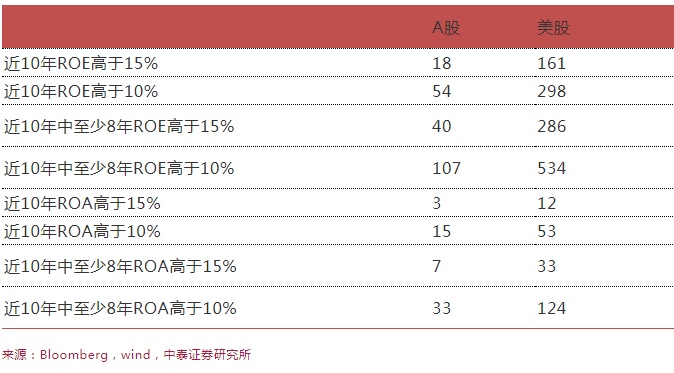 中美长期高ROE和高ROA个股数量(截止2019年)