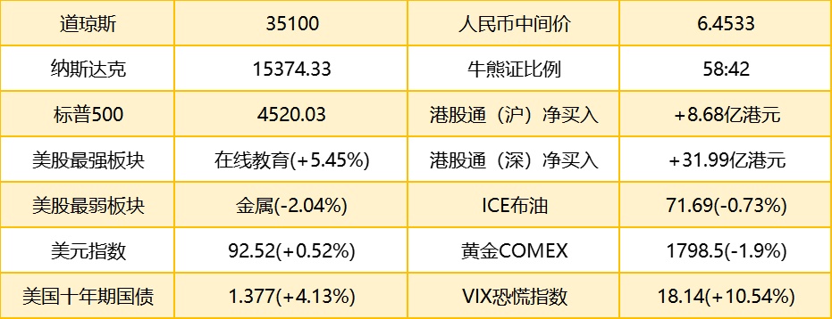 1. 隔夜美股截至收盘,道指跌269.09点或0.76%,报35100.00点;纳指涨10.81点或0.07%,报15374.33点;标普500指数跌15.40点或0.34%,报4520.03点。港股ADR指数按比例计算,收报26386点,上涨32.63点或0.12%。特斯拉(TSLA.US)收涨2.64%,收盘价752.92美元,创近5个月来的最高收盘价。摩根士丹利报告称,美国8月非农就业数据实在是太糟糕了,新增就业岗位仅23.5万个,创下今年1月以来最差表现,远远低于经济学家预测的72万,也没有达到美国总统拜登声称的每月可以新增60万个的目标。该行认为,美国经济增速在今年下半年急剧放缓,主要由于经济增长的动力已提前释放。