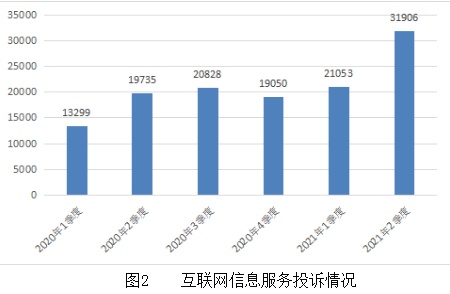 互联网信息服务投诉平台共收到互联网用户投诉31906件,环比上升51.6%。其中,个人信息保护类投诉5818件,占比18.2%;服务功能类投诉13083件,占比41.0%;企业投诉机制类投诉7087件,占比22.2%;其他类投诉5918件,占比18.6%。2021年上半年趣头条、唱吧等10家企业在互联网信息服务投诉平台中投诉处理及时率较低,工业和信息化部已督促相关互联网企业抓紧提升处理及时率(详见附件3)。