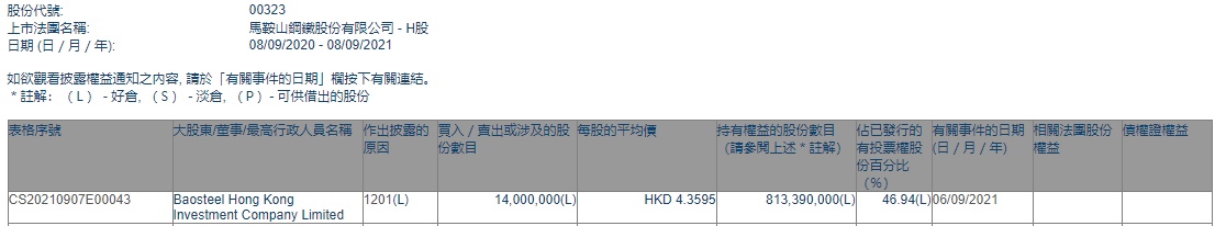 智通财经APP获悉,香港联交所最新资料显示,9月6日,Baosteel Hong Kong Investment Company Limited减持马鞍山钢铁股份(00323)1400万股,每股作价4.3595港元,总金额为6103.30万港元。减持后最新持股数目约为8.13亿股,最新持股比例为46.94%。
