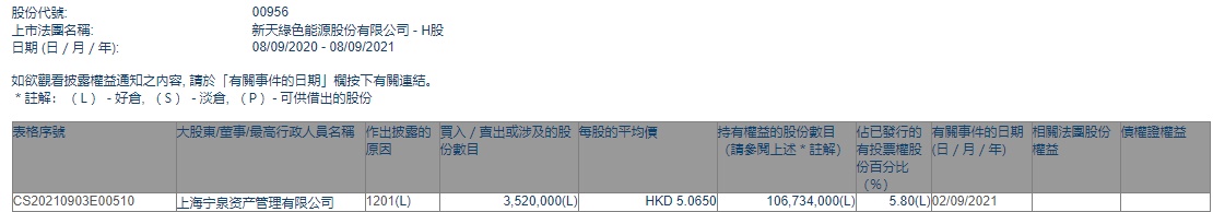 智通财经APP获悉,香港联交所最新资料显示,9月2日,上海宁泉资产管理有限公司减持新天绿色能源(00956)352万股,每股作价5.0650港元,总金额为1782.88万港元。减持后最新持股数目为1.07亿股,最新持股比例为5.80%。
