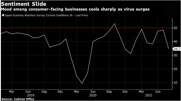 智通财经APP获悉,日本经济观察家现状指数在8月份出现暴跌,这是自疫情早期以来的最大跌幅,主要原因在于新冠病毒Delta变种的蔓延导致新病例数破记录,最终迫使日本现任首相放弃寻求连任。