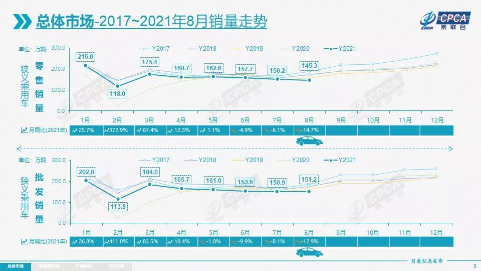 智通财经APP获悉,乘联会发布2021年8月份全国乘用车市场分析报告,报告显示2021年8月乘用车市场零售达到145.3万辆,同比下降14.7%,而且相较2019年8月下降7%,增速偏弱。8月厂商批发销量151.2万辆,环比持平,同比下降12.9%,较19年8月下降7%。1-8月累计批发销量1284.3万辆,同比增长16.2%,较2019年同期减少26万辆。