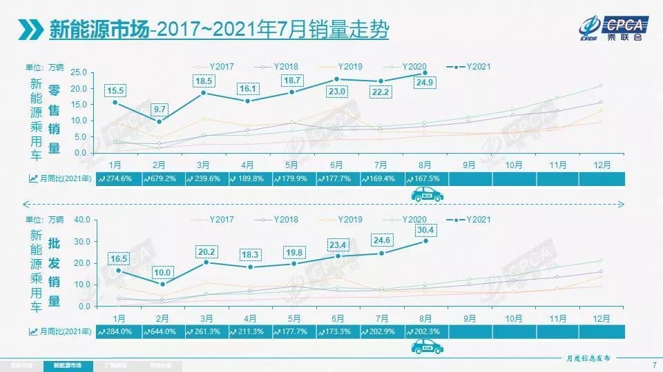 新能源方面,8月新能源乘用车批发销量达到30.4万辆,同比增长202.3%,环比增长23.7%。1-8月新能源乘用车批发164.3万辆,同比增长222.5%。8月新能源乘用车零售销量达到24.9万辆,同比增长167.5%,环比增12.0%。1-8月新能源车零售147.9万辆,同比增长202.1%。与传统燃油车走势形成强烈差异化的特征,实现对燃油车市场的替代效应,并拉动车市向新能源化转型的步伐。