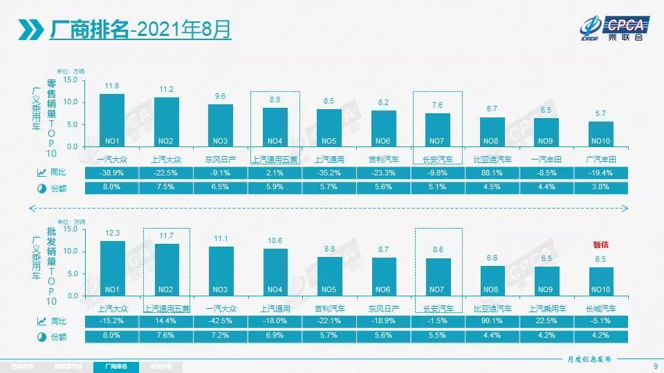 8月自主品牌零售60万辆,同比增长6%,环比下降5%,相对2019年8月增长10%。自主品牌国内零售份额为42.1%,同比增8.3个百分点。批发市场份额45%,较同期份额增长8.8个百分点;且自主品牌头部企业产业链韧性强、有效化解芯片短缺压力,变不利为有利,在新能源获得明显增量,因此比亚迪、广汽埃安、上汽乘用车等传统车企品牌同比均呈高幅增长。